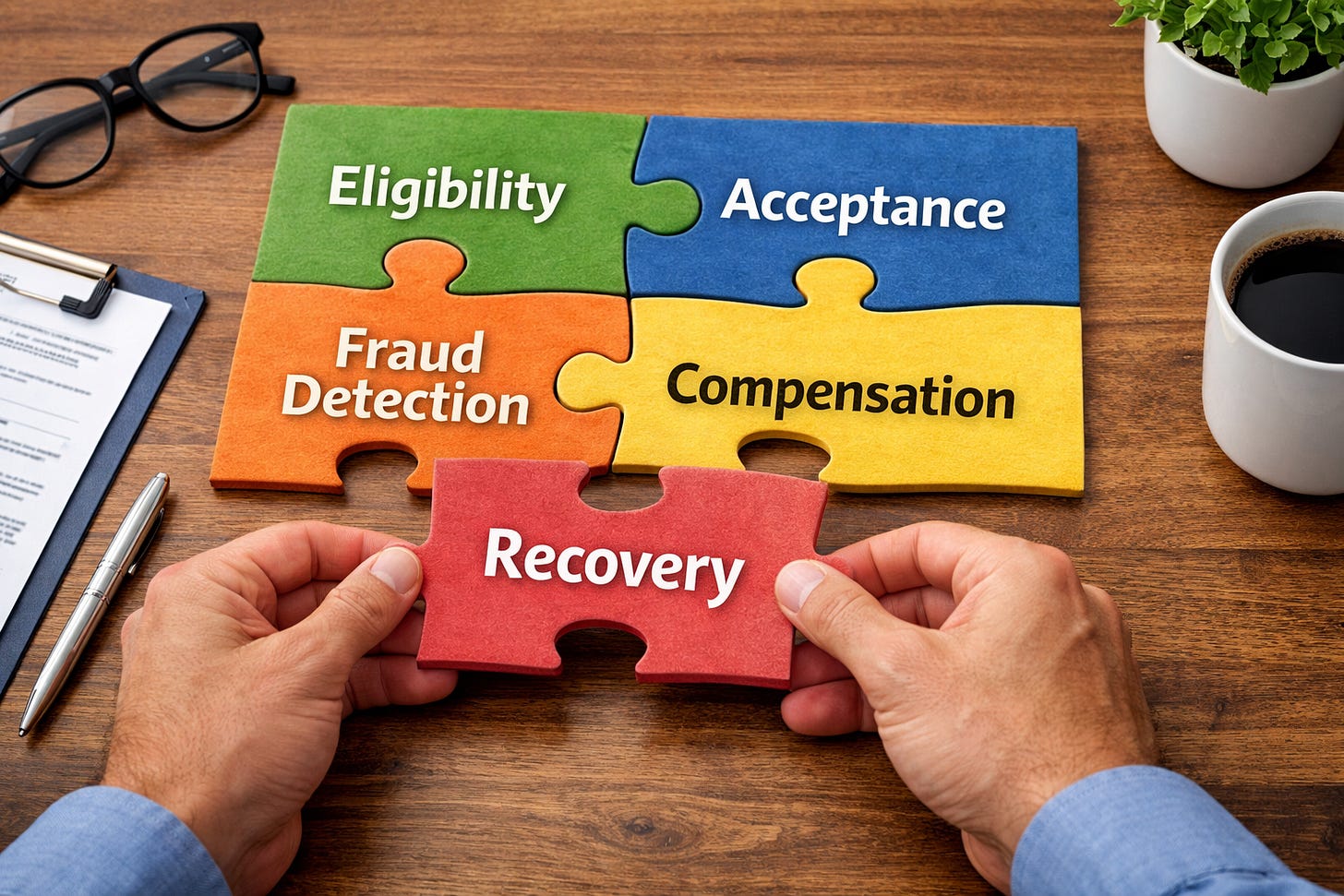 Instead of creating separate DMN models for Eligibility, Acceptance, Fraud, Compensation, and Recovery, you create a comprehensive decision model that: